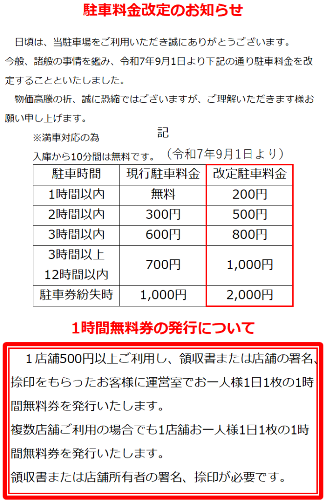 9月からの駐車料金改定の追加情報